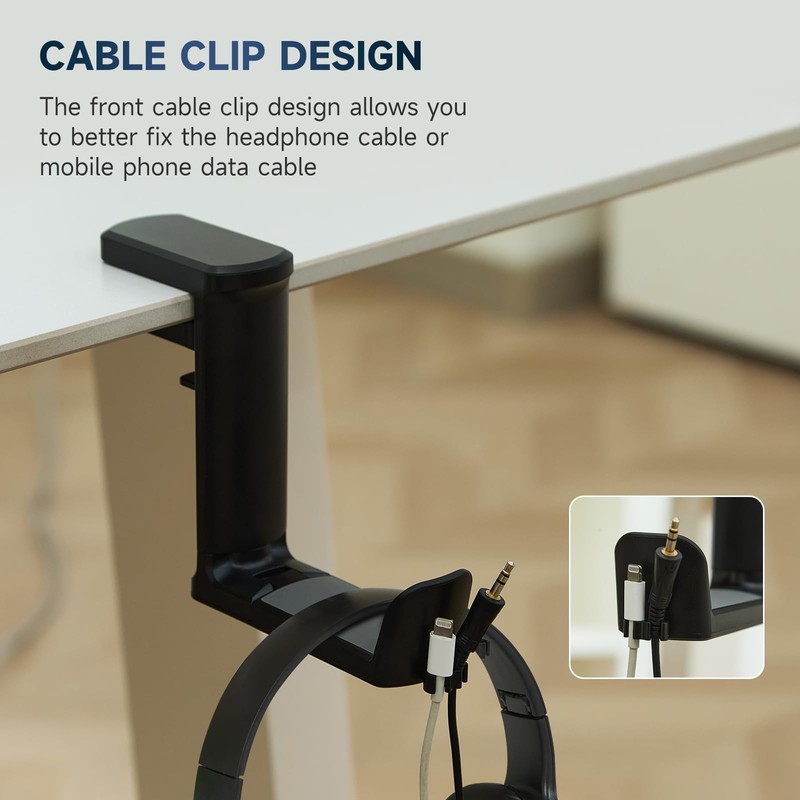 - With cable organizer: The headphone stand is designed with two cable clips, which can be used to fix the headphone cable or mobile phone data cable, ensuring that your desktop is tidy and clean. It is a very good desktop accessory.