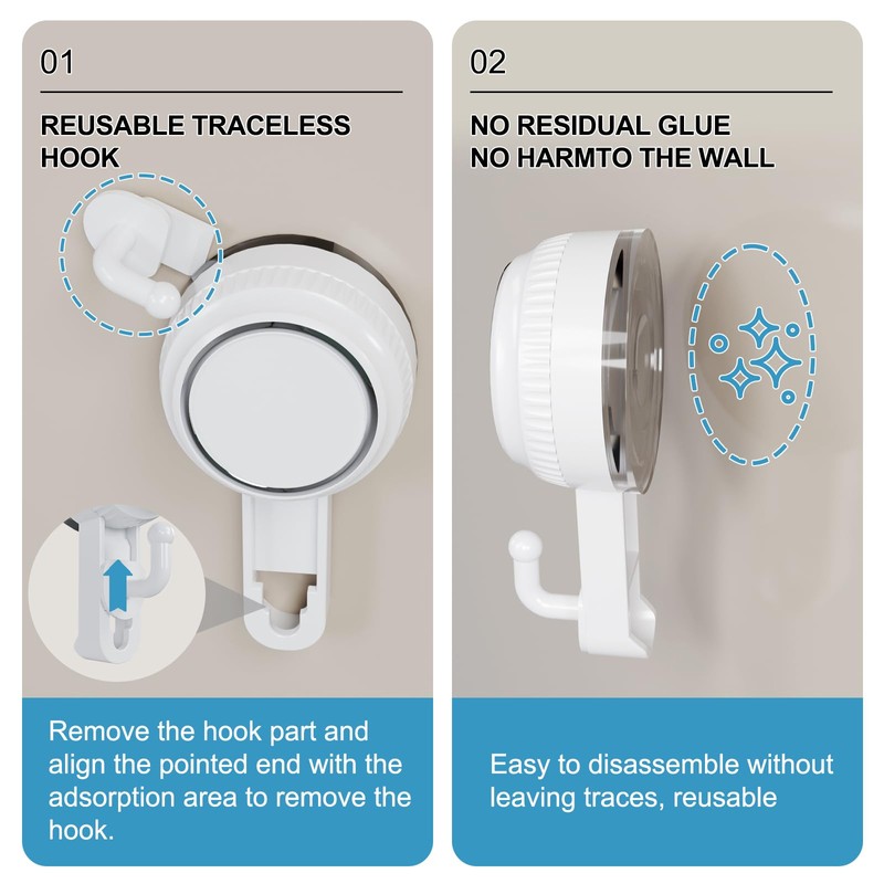- [Reusable & Easy Maintenance] The hook detaches from the suction hooks for separate cleaning or replacement. If suction weakens, gently pry the edge with a credit card or the hook tip, soak in warm water, and air-dry to restore strong adhesion. Reuse infinitely, cost-effective