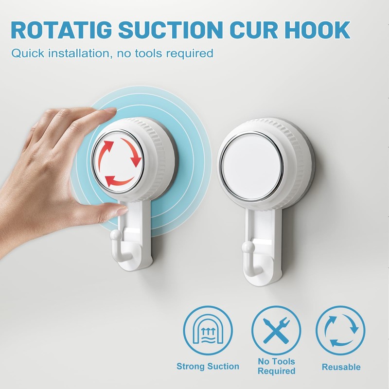- [Hassle-Free Installation] With suction shower hooks, no drilling or adhesives required! Simply press the silicone base onto a clean surface, turn the knob clockwise to lock in place. No damage to your wall, perfect for renters and temporary room upgrades