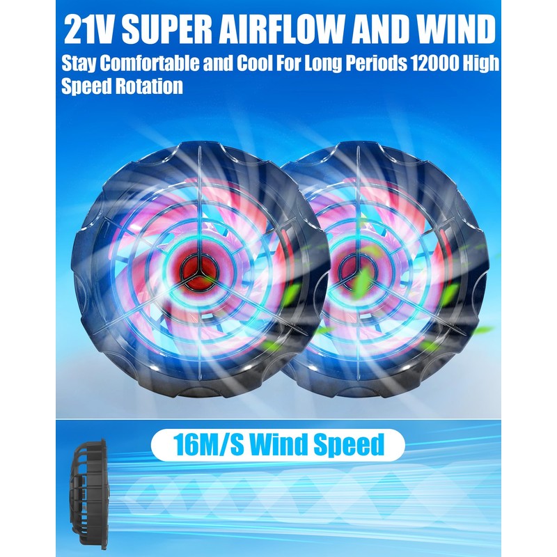 - đ§ăCOOLING FAN VEST, POWERFUL AIRFLOW, 9-22-HOUR LONG BATTERY LIFEăThe secret to keeping cool in this cooling fan vest with two discreet USB quiet fans. This time, we've used domestically produced "brushless motors," emphasizing performance: a high rotation speed of 4800 rpm, a maximum airflow of 80 liters per second, and can typically last from 9 to 22 hours at 21V voltage. Each USB fan weighs 85 grams and is 38 mm thick, so you won't even notice the weight.