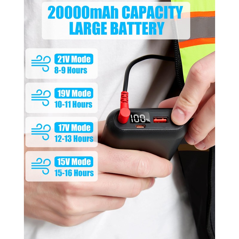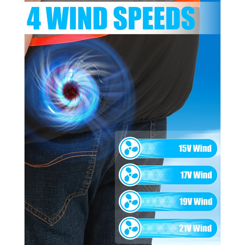- đ§ăTHREE-SPEED WIND ADJUSTMENT/UNRESTRICTED MOVEMENTăThe cooling vest fan has 4 adjustable wind speeds, allowing you to freely choose from 21v/19v/17v/15v speeds. The fan is lightweight, so you won't feel any pressure on your body. Since it is vest-style, it won't restrict movement, providing comfortable wear. You can also use it in the office since the fan won't impact the backrest when seated, and it can function normally.
