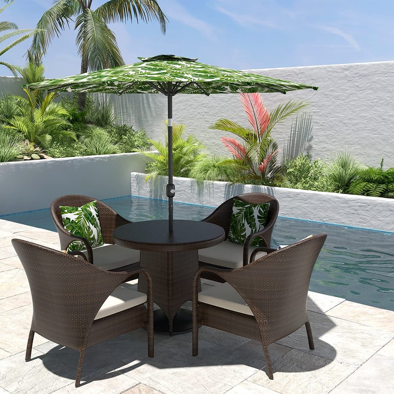 - SIZE: Diameter of this patio umbrella is 9 feet, suitable for 42”-54” table with 2-4 chairs. Total height - approx. 7.5 feet. It keeps you cool, relaxing and comfortable. (NOTE: Umbrella BASE NOT Included).