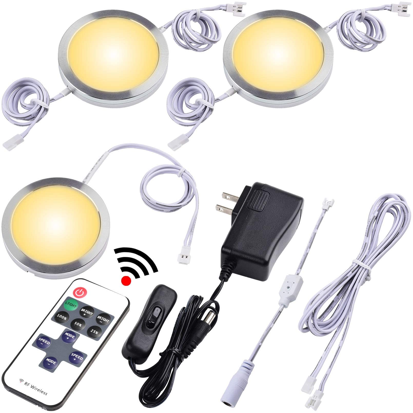 Book Case Lights, Mini Under Shelf Cabinet Puck Lihgting, 120V Wall Plugged in Adapter, Wireless Dimmable LED RF Remote Controller, Linkable White Cables, Warm White 2700K, 3 Lights