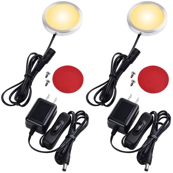 Lvyinyin Single LED Under Cabinet Puck Light, Display Case Shelf Counter Lighting, 120V AC Wall Plug with On Off Switch, Non-dimmable, Warm White, 2 Packs