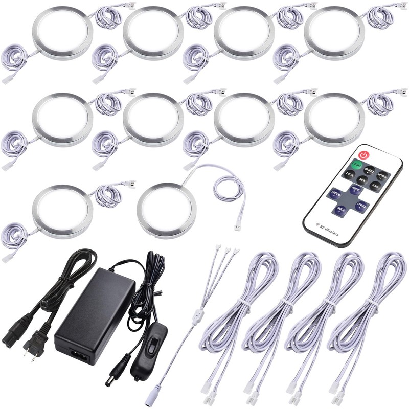 Lvyinyin Under Bar Lighting, Workspace Accent Light Kit, 120V Cabinet LED Puck, Daisy Chained Linkable, Plug-in & Hardwiring, Wireless RF Remote Control Dimmable, White Cables, Daylight, 10 Lights