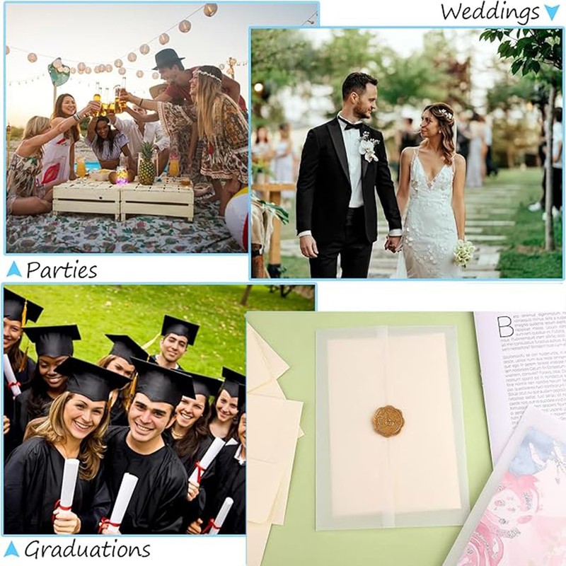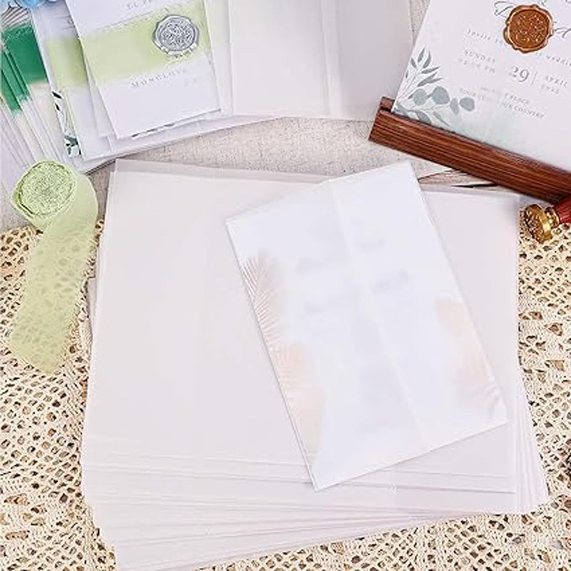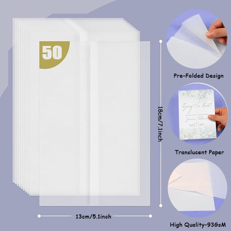 - Package Include: You will receive 50 sheets of vellum paper for invitations, each size is 5.1 x 7.1 inch, the translucent design reveals the invitation pattern inside while adding a matte touch without losing elegance. Provides an excellent protection when wrapping invitations or greeting cards