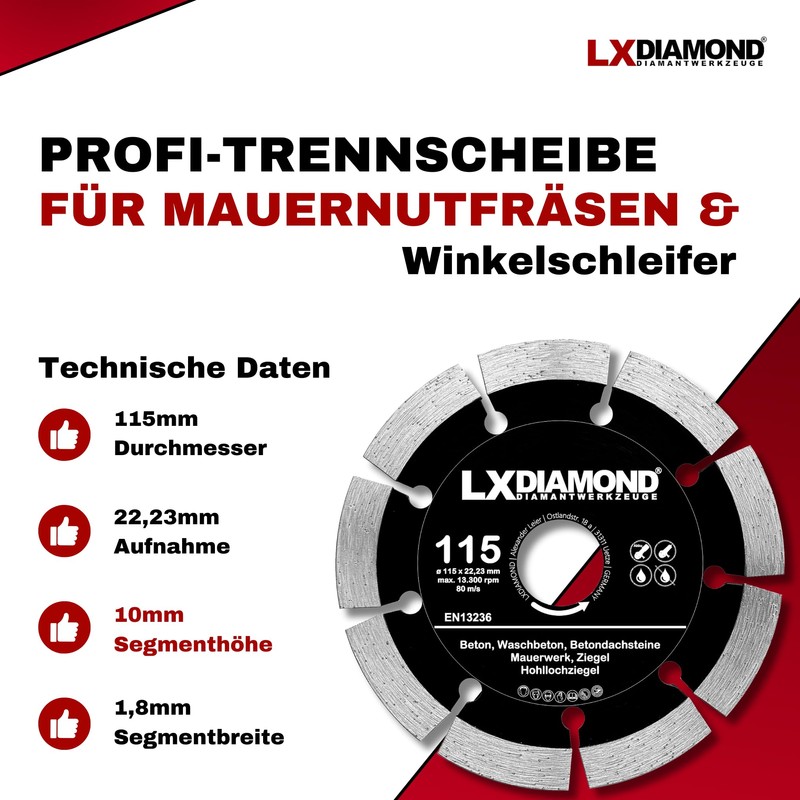 - Technical data: 115 mm x 22.23 mm (standard), cutting discs with 10 mm high diamond segment coating allows a long service life, the stone disc is suitable for wet and dry cutting