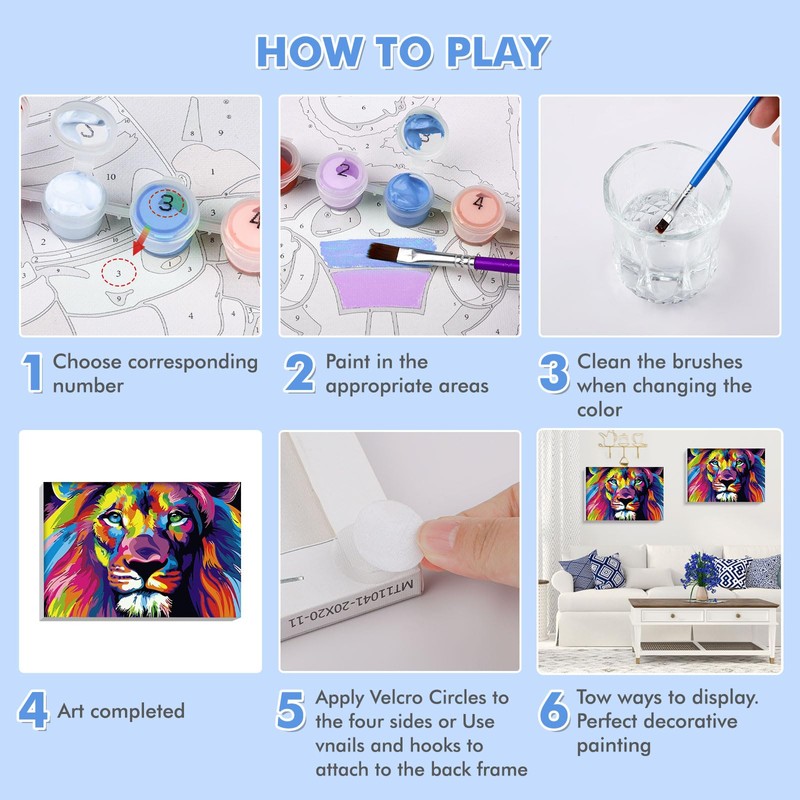 - What you get: Each Lxmsja paint by number set contains a canvas with wooden frame and 3 brushes with different tips. Easily hang your masterpiece with the included hooks or self-adhesive dots for a stunning wall decor