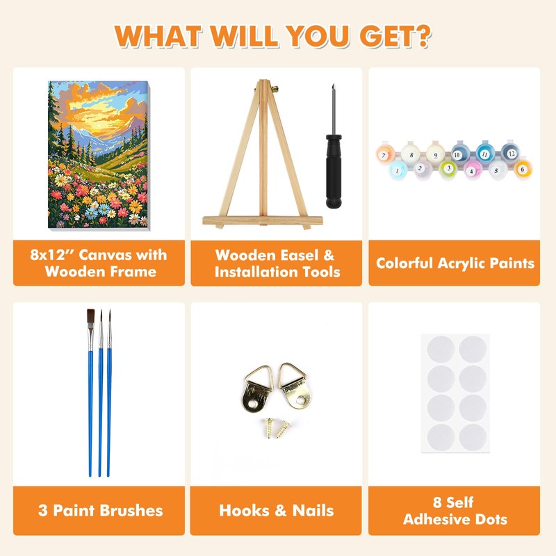- What you get: Each paint by number kit contains a canvas with wooden frame, a wooden easel and 3 brushes with different tips. Easily hang your masterpiece with the included hooks or self-adhesive dots for a stunning wall decor