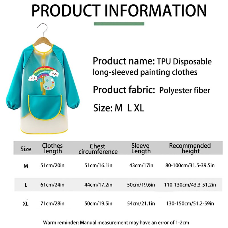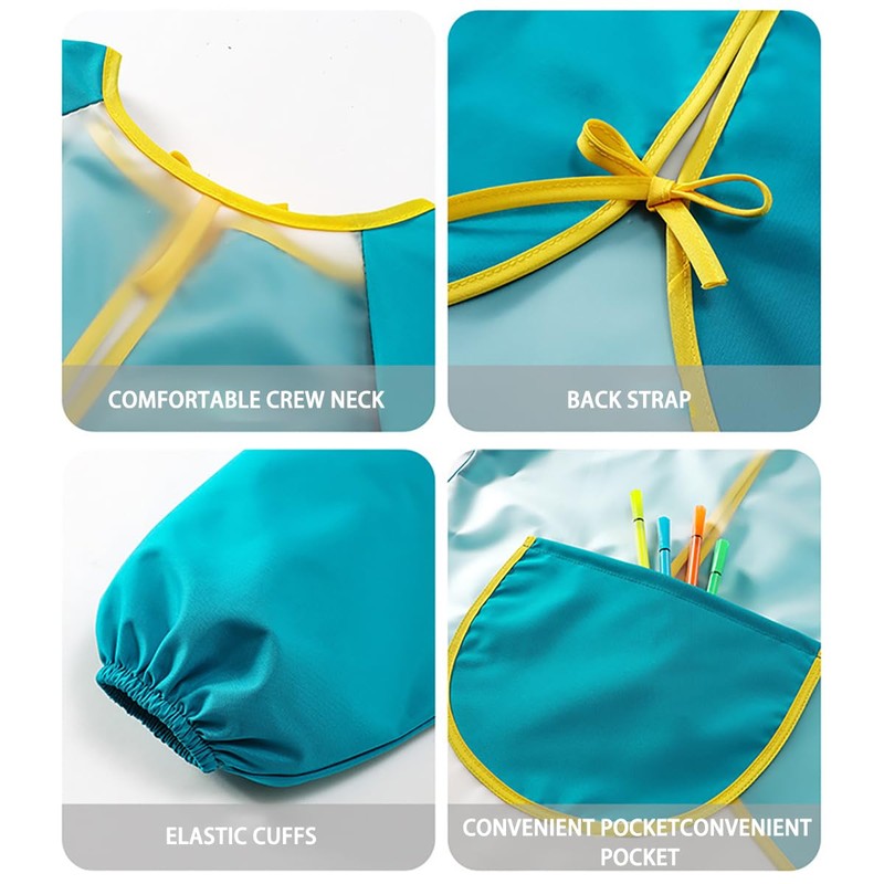 • Design: Waterproof smocks are designed with beautiful and cute cartoon picture, let your baby loving to wear it. Tieback on smock collar, Long sleeves with elastic. can adjusted to let kids wear comfortable.