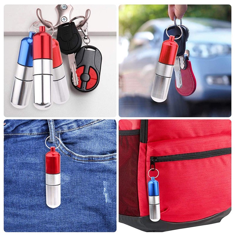 - [What you will get]: 2 Pcs different color aluminum alloy key chain pill case. Our pill box has a beautiful and practical appearance, which can perfectly store pills, vitamins, USB flash drives, batteries, toothpicks, matches, and cigarettes. You can adjust the length according to your needs.