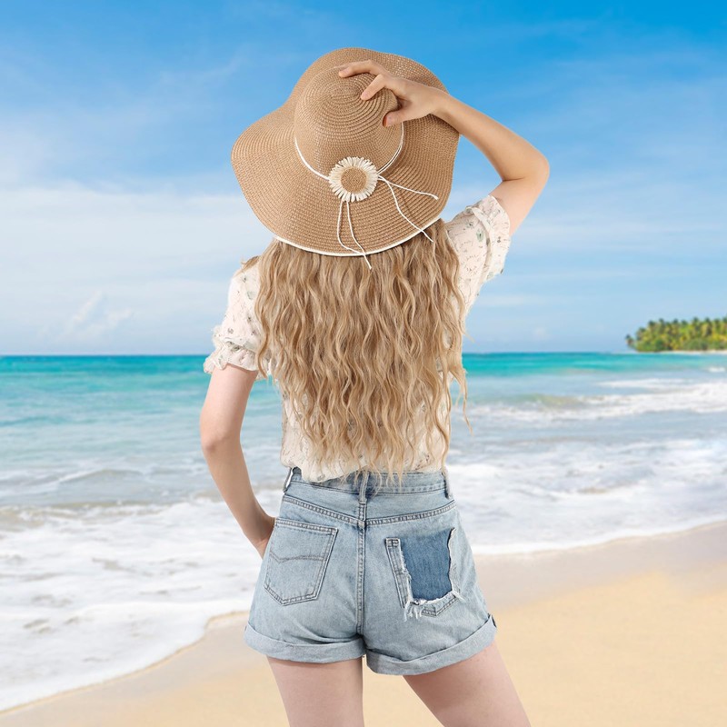 LY4U Women's Wide Brim Straw Hat, UPF 50 Summer Beach Hat, Floppy Foldable Roll Up Travel Hat for Women, khaki