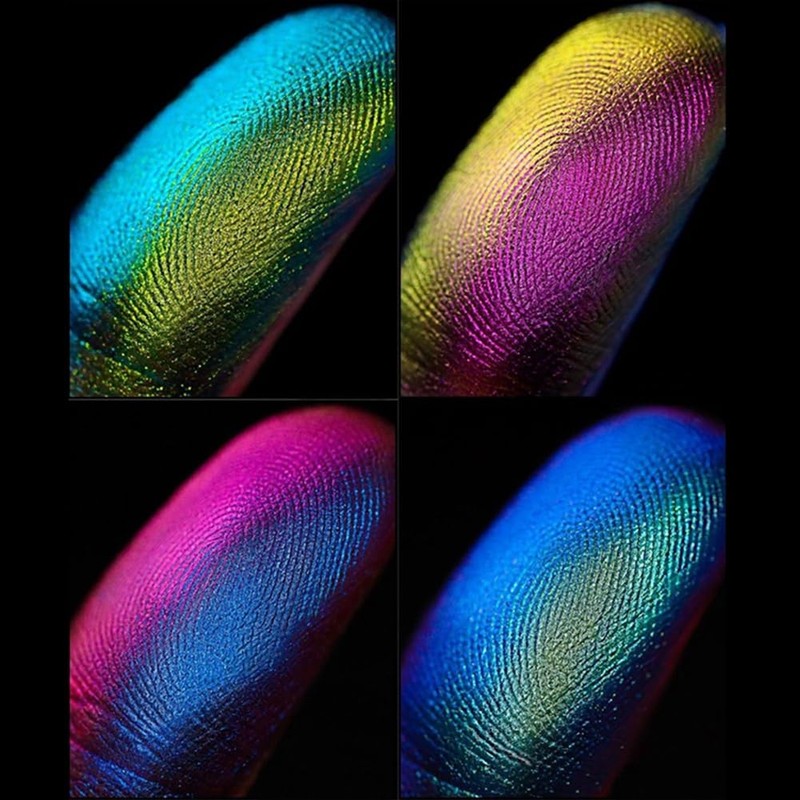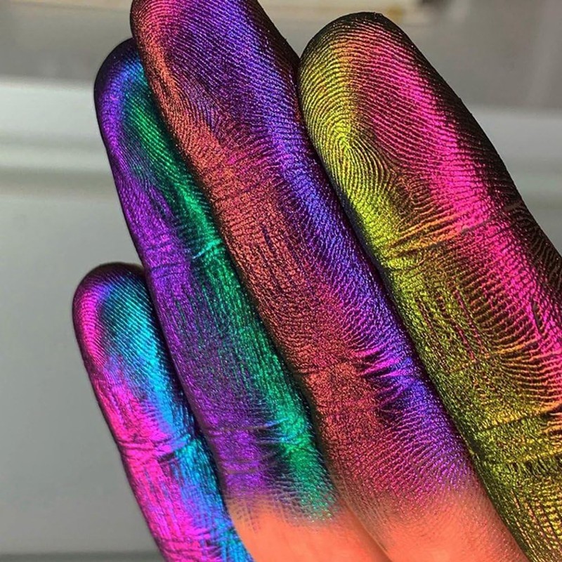 - Intense color shifts-including blue-cyan-bright green-yellow-green and everything in between. Appears to be only one color when viewed from the front, however, color variations become visible when viewed at different angles and under different lighting on rounded surfaces such as eyelids