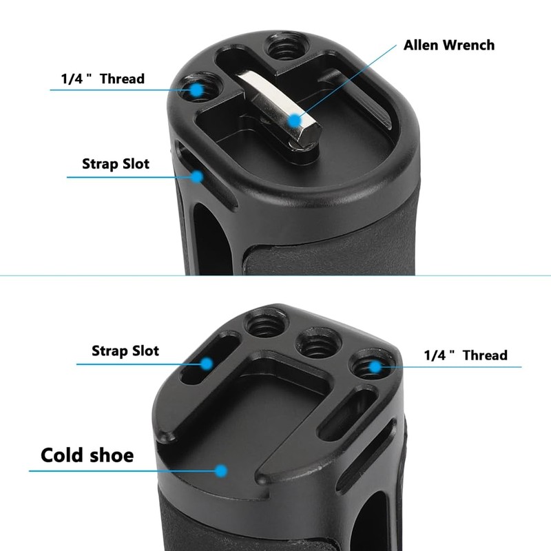 • The thumbscrew mount attaches to a sliding mechanism that allows you to slide the handle up and down within a range of 1.3 inch for your preferred position. It features 1/4 inch-20 mounting threads as well as a shoe mount on the grip to add a light, microphone, monitor, mounting arm, or other accessories.