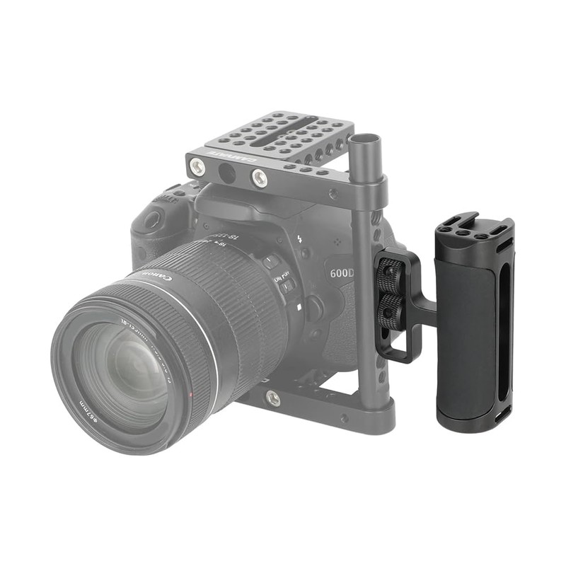 • Add a handle to either side of your camera rig or cage for stable with this univeral side handle. The handle mounts to the cage with two thumbscrews spaced 0.7 to 1.2 inch apart.