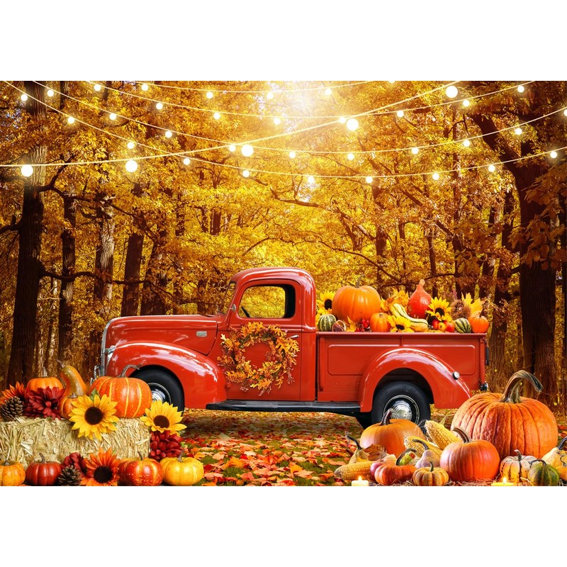 LYCGS 7X5ft Fall Photography Backdrop Fall Thanksgiving Party Backdrop Autumn Forest Maple Leaf Sunflower Pumpkin Haystack Red Car Photo Background Thanksgiving Decoration Banner X-161