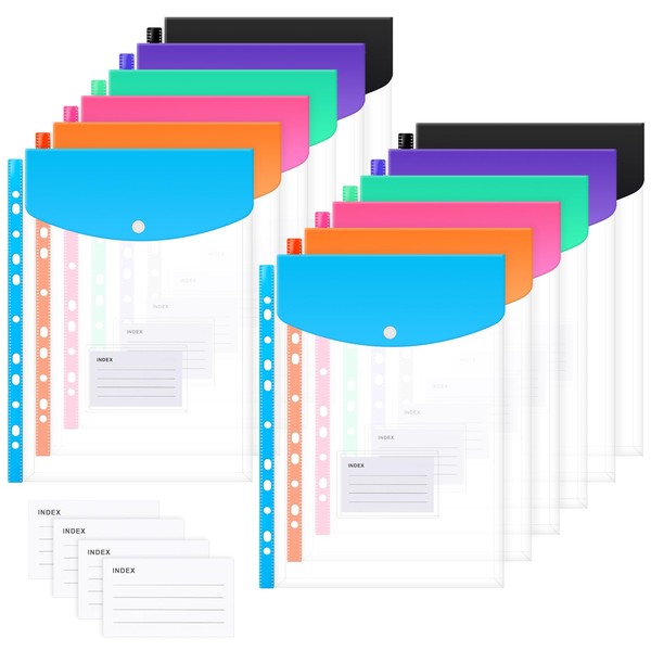 Lychico Plastic Wallets A4 Punched Pockets (12 Pack), 11 Holes Expandable Binder Folders for 2/3/4 Ring Document Pouch with Snap Button & Label Loose-Leaf Transparent for Office School Home