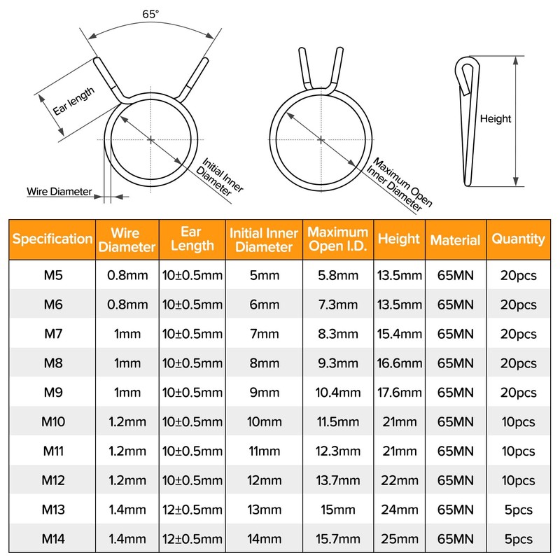 - Package includes: contains 140 pieces spring hose clamps, 10 different sizes: 5 mm, 6 mm, 7 mm, 8 mm, 9 mm, 10 mm, 11 mm, 12 mm, 13 mm, 14 mm. Enough quantity to meet your different needs.