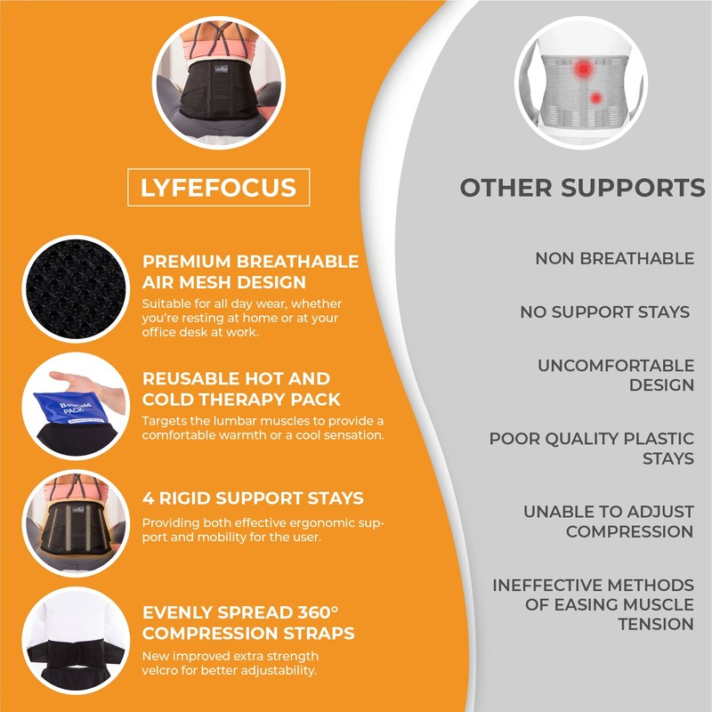 LyfeFocus Premium Adjustable Lower Back Support Belt for Men & Women - Breathable Lumbar Support Brace Supplied with Reusable Hot Cold Pack for Pain & Muscle Tension Relief (Check Size Table: Large)