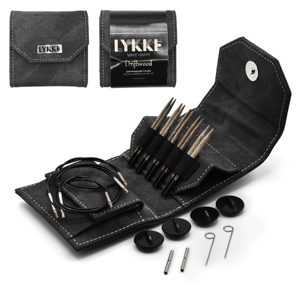 Lykke - 3.5" Driftwood Interchangeable Needles Starter Set, Grey Denim Pouch