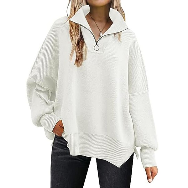 Lynkiss Women's Oversized Sweater Long Sleeve 1/4 Zipper Collar Drop Shoulder Slouchy Pullover Tops White