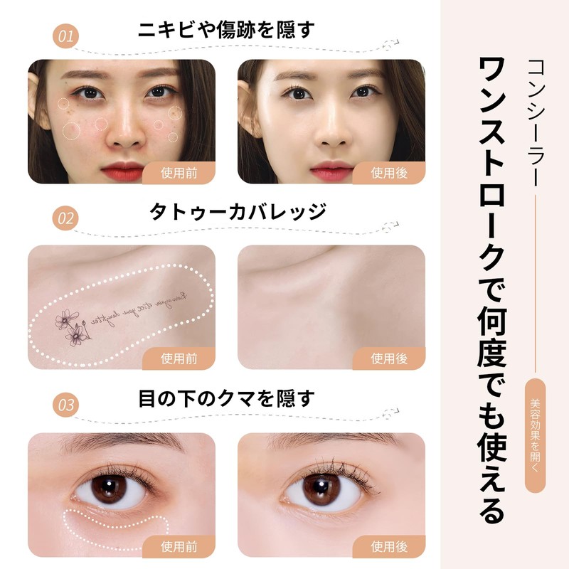 • 24-hour long lasting & sweatproof design Adhesive film technology that does not damage makeup and protects against sweat and sebum, waterproof and sweat resistant formula, making it a long-lasting concealer that can be used all day. No need to touch up makeup, even in sports or hot summer days