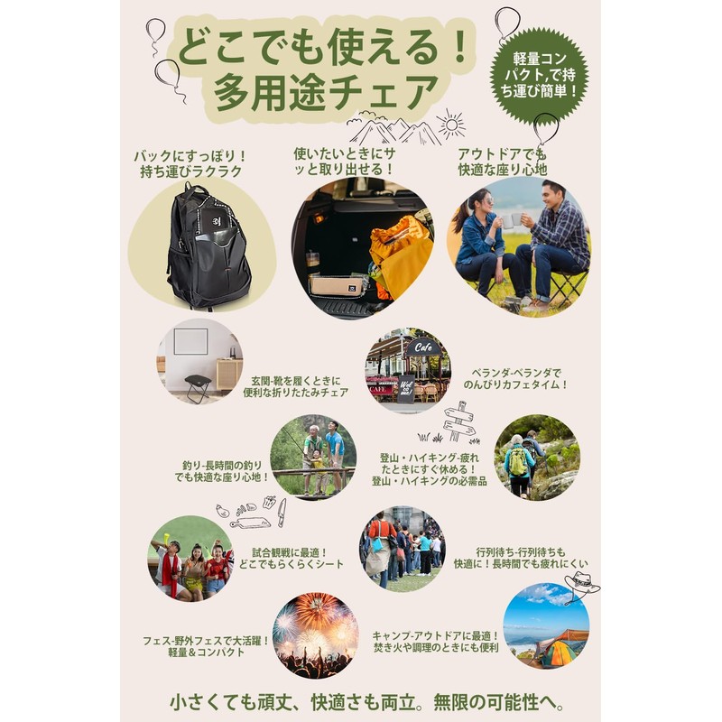 - Lightweight & Compact | Portable chair that is easy to carry anywhere: The main unit weighs only 15.3 oz (445 g) (± 0.2 oz (5 g)) and is as light as a plastic bottle. When folded, it fits perfectly in a backpack, and is perfect for camping, climbing, fishing, parks, and watching sports. Easy to carry for women and children
