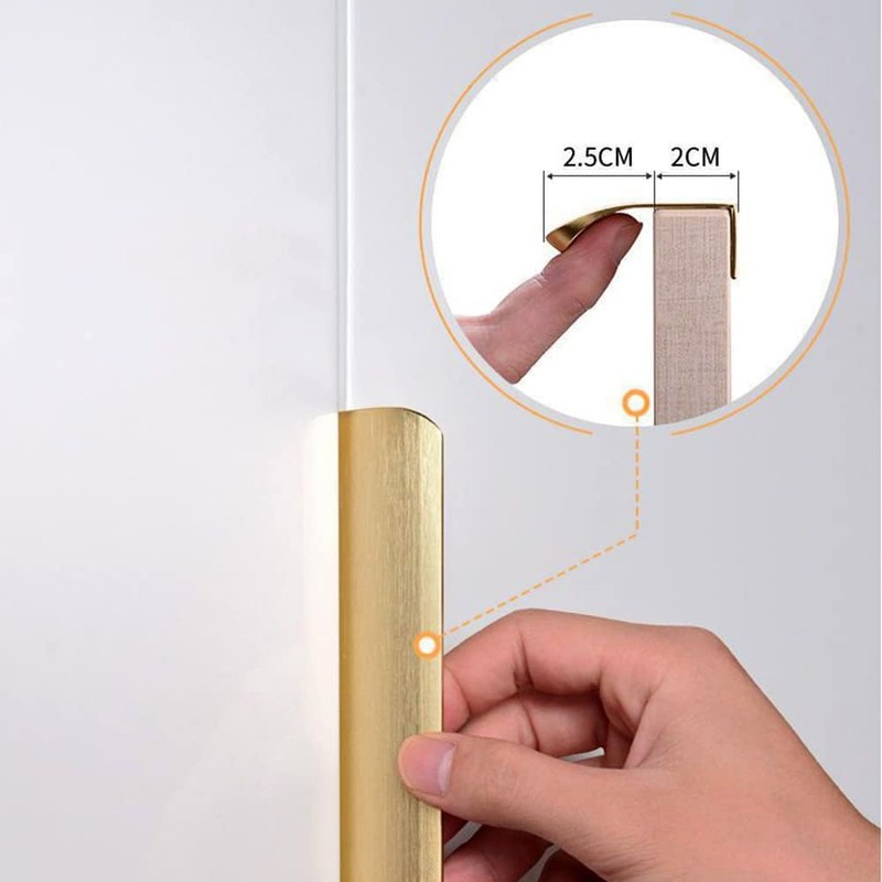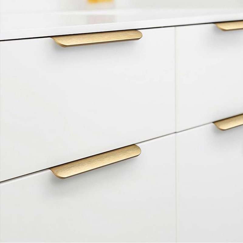 - Design: 5 gold concealed cabinet handles with thick, rounded corners and polished sharp edges to prevent scratches and injuries. Hidden and smooth arc, increase the handle distance, save strength and does not slip off when opening the door. It is beautiful and integrated into the cabinet door and highlights the fashionable living style.