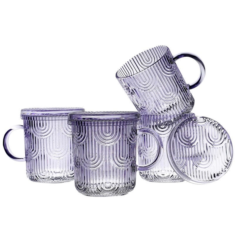 Lysenn Glass Coffee Mugs Set of 4 - Premium Crystal Glass Mugs with Lids – Unique Design Coffee Glasses for Tea Latte Cocoa Chocolate - 10 oz, Amethyst Purple