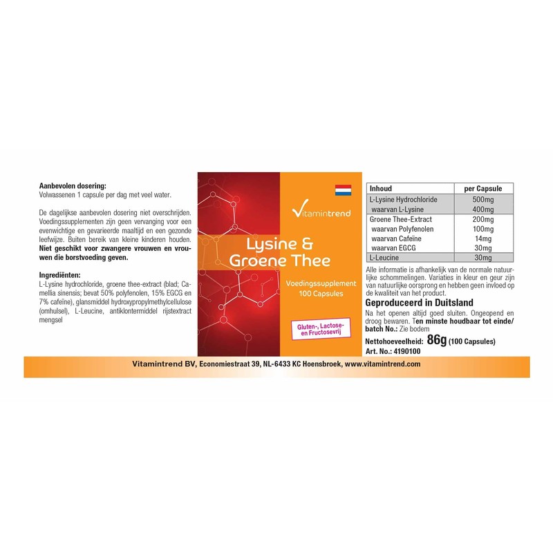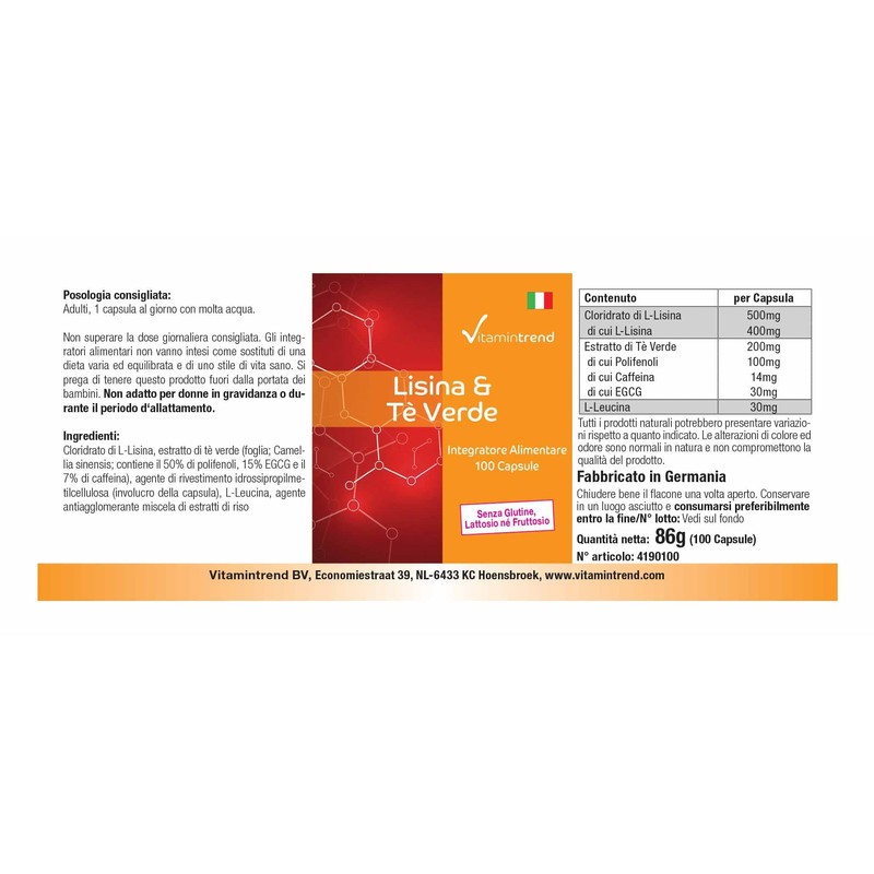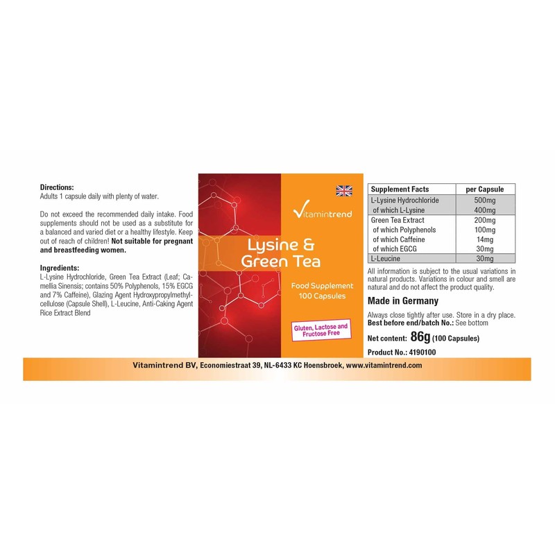 - Free from: fructose, lactose, gluten, yeast, gelatin, soy, flavours, magnesium stearate, preservatives, pesticides, fungicides, artificial fertilisers, dyes, stabilisers, GMOs, magnesium stearate and allergens. L-lysine with green tea dietary supplement from Vitamintrend with excellent absorption. Rich vital substance combination for 100 days