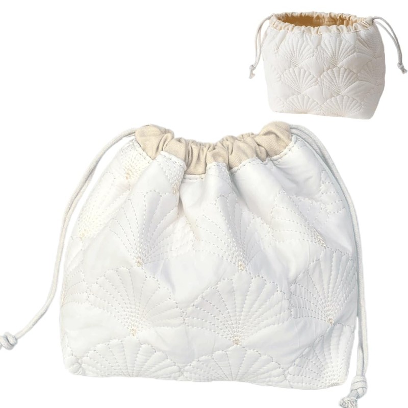 Lyssiatina Drawstring Cotton Quilted Makeup Bag,Coquette Cute Travel Toiletry Organizer with Canvas Lining,Aesthetic Cosmetic Pouch for Women & Girls(White Seashell)