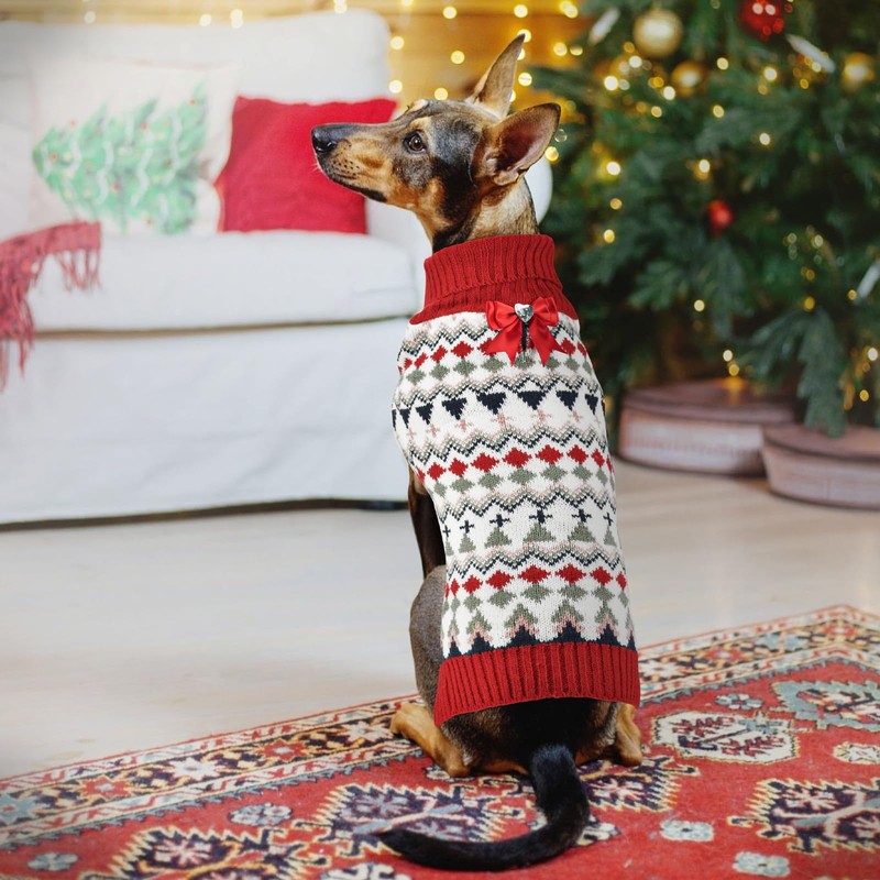 - 【Cute Xmas Elements Design】The puppy sweaters are designed for celebrating Christmas. classic red and white colors argyle pet sweater knitted with red bow, The wavy pattern alternates with the diamond pattern, your dog will look extra cute while staying cozy.