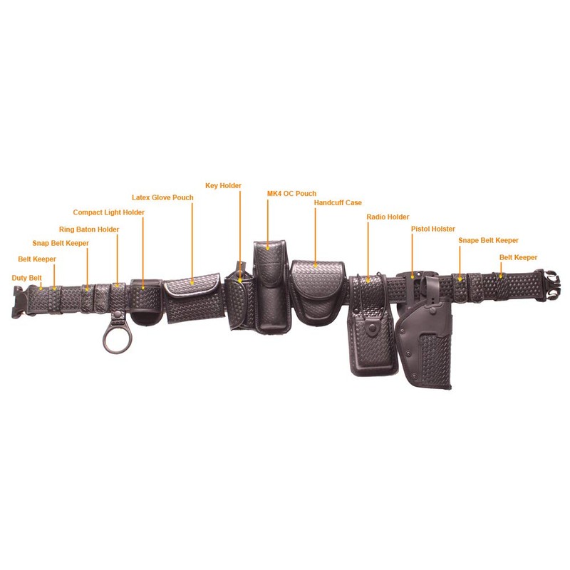 - 10-in-1 Police Duty Utility Belt Rig includes-2 inch duty belt, pistol holster, handcuff case, radio pouch, light holder, belt keeper, baton holder, key holder, MK4 holder