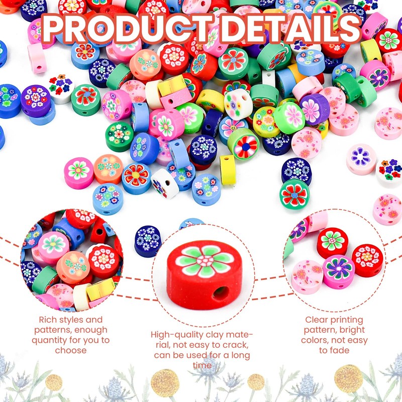 1. Soft polymer clay craft beads. You will receive 200 soft clay beads with floral patterns in different colours and styles. The flower beads have a diameter of 10 mm, a thickness of 5 mm and an opening of 1 mm. They can be threaded through bead wire and wire to make a refined bead bracelet.