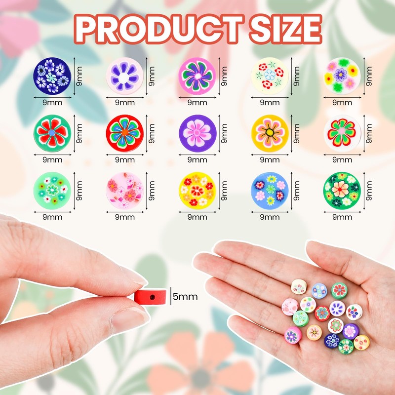 - Easy to use: the size of the clay flower jewellery beads is 7-10 mm diameter and 5 mm thick, each piece of flower beads has a 1 mm hole that can fit through the bead wire and the metal wire, so you can easily thread the fruit beads together to create a unique colourful fruit bracelet.