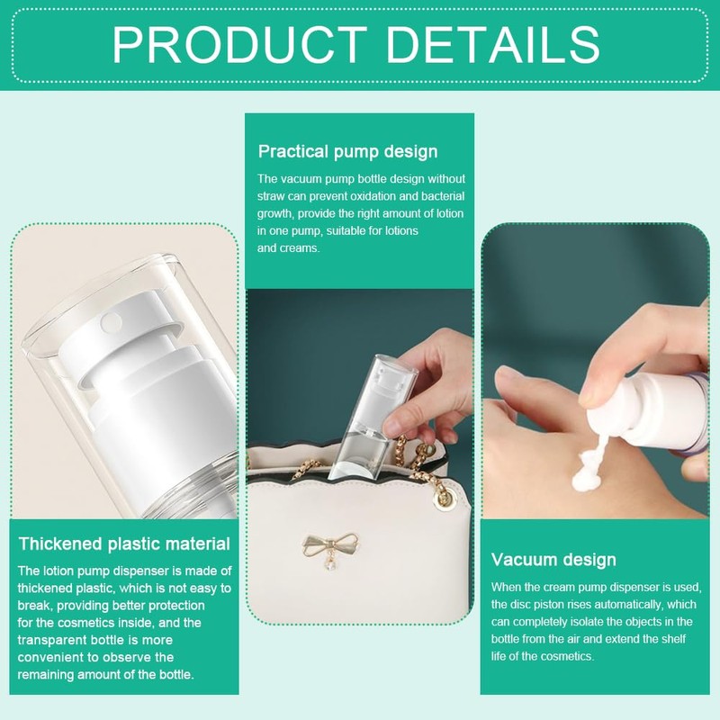 - Vacuum pump design: vacuum travel bottles for filling have a vacuum design without straw that prevents the oxidation of cosmetics and skin care products and thus extends their durability. When you press the pump head, the piston moves down to the top. When the bottle contents are used up, the plunger is located at the top of the bottle. When you need to refill the lotion, simply press the plunger down with a cotton swab.