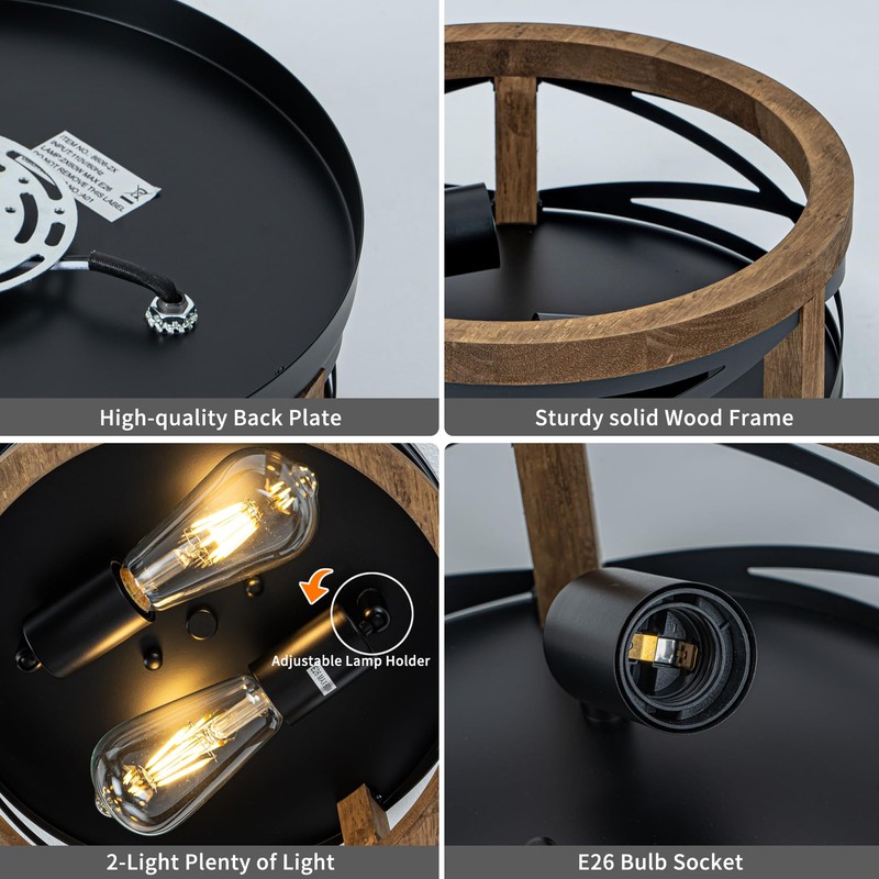 - E26 Bulb Compatibility – The wood ceiling light fixture supports 2 x E26 base bulbs (max 60W each, bulbs not included), compatible with LED, CFL, Edison, or incandescent bulbs, and fully dimmable when used with a dimmer switch.