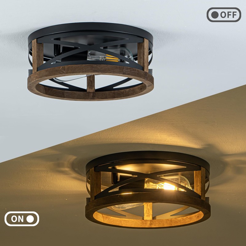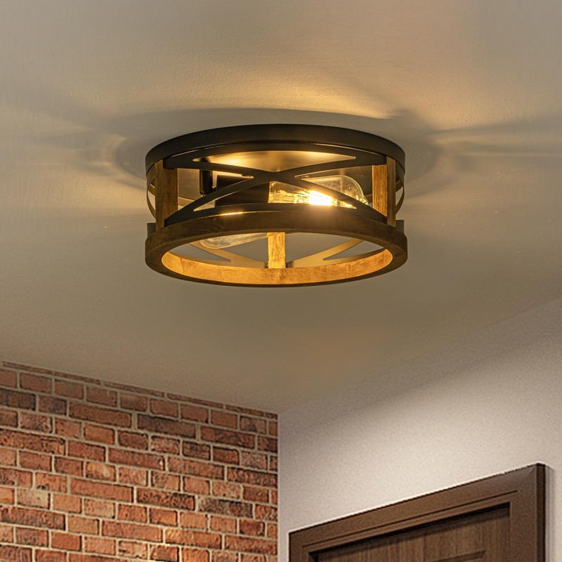 - Rustic Farmhouse Design - Farmhouse ceiling light featuring a round solid wood frame paired with black matte metal, this 2-light flush mount ceiling light adds a warm farmhouse charm with industrial style, perfect for modern rustic or vintage interiors.
