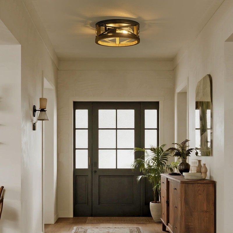 Lzglyptics Farmhouse Ceiling Light, 2-Light Round Flush Mount Ceiling Light with Wood and Metal Frame, Black Rustic Light Fixture for Hallway, Entryway, Bedroom, Kitchen