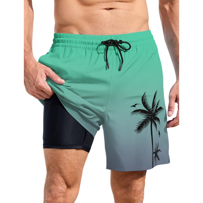 Lzzidou Men Swim Trunks with Compresssion Liner 7 Inch Inseam Board Shorts Bathing Suit with Zipper Pockets Green Grey