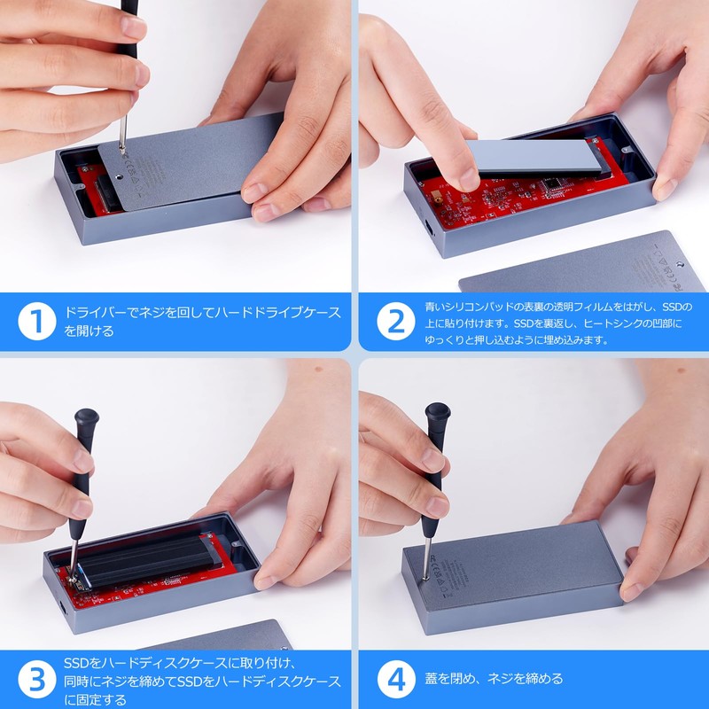 - Package Includes: 1 x M.2 NVME SSD External Case; 1 x 2-in-1 Cable (Type-C to Type-C/USB-A - 40Gbps) 1 x Heat-dissipating Silicone Pad; 1 x Screwdriver; 2 x Anti-Vibration Rubber Mounting Screws for SSD; 1 x Aluminum Alloy Heat Dissipation Vest. We provide a 1 year warranty from your purchase to avoid any damage to our product. If there is any problem, please feel free to contact us. Note: If the disc partition is not recognized, there are multiple reasons and you need to check whether the original partition is damaged, so please contact us immediately and let us know the specific problems. We provide the most suitable solution for you