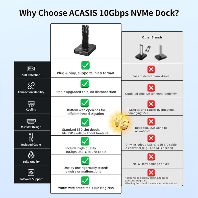 - 【Plug & Play Driver-Free Design】No driver installation is required. Simply insert an NVMe or M.2 SATA SSD into the dock slot, connect the USB-C cable, and start data transfer and backup immediately. It supports hot-swapping (Note: Do not replace the hard drive while connected), making it newbie-friendly for effortless switching and high-speed reading of M.2 SSDs.
