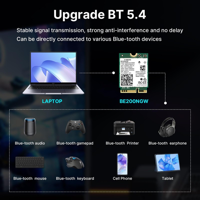 - The WiFi 7 BE200NGW WiFi Card supports 2x2 TX/RX streams, uses 2.4GHz, 574Mbps, 5GHz,2400Mbps, and 6GHz,5800Mbps bands, and the BE200 has a maximum speed of 5Gbit/s, which is significantly below the maximum transfer rate supported by the standard.WiFi 7 BE200NGW also supports PCIe (With a PCIe Adapter)and USB interfaces and can be used for desktop motherboards and laptops.It can also achieve "self" load balancing, using its own multi-channel advantages for concurrent data transmission. Solve the problem that WiFi 6 cannot automatically switch bands.