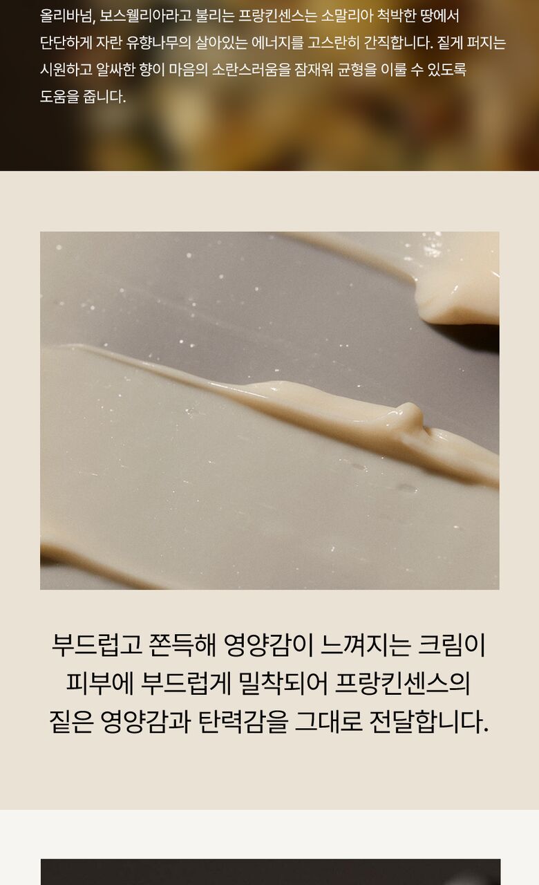 | 화장품법에 따라 기재/ 표시하여야 하는 모든 성분 | 프랑킨센스 세럼: 흰목이버섯추출물, 영지버섯추출물, 잎새버섯추출물, 진흙버섯추출물, 정제수, 부틸렌글라이콜, 글리세린, 판테놀, 카프릴릭/카프릭트라이글리세라이드, 에틸헥실팔미테이트, 나이아신아마이드, 호호바씨오일, 트라이에틸시트레이트, C14-22 알코올, 에리스리톨, 바쿠치올, 베타-글루칸, 호호바에스터, 글리세릴글루코사이드, C12-20 알킬글루코사이드, 1,2-헥산다이올, 세테아릴알코올, 하이드로제네이티드레시틴, 카프릴릴글라이콜, 스타아니스추출물, 잔탄검, 아데노신, 유향나무검오일(400ppm), 라다넘수지, 웨스트오스트레일리아산달우드목부오일, 라반딘오일, 알지닌, 카보머, 타마린드씨폴리사카라이드, 피마자씨오일, 분비나무오일, 다이소듐이디티에이, 로즈마리잎오일, 한련초추출물, 인도멀구슬나무꽃추출물, *리날룰, 홀리바질잎추출물, 인도멀구슬나무잎추출물, *리모넨, 소듐하이알루로네이트, 비피다발효용해물, 락토바실러스발효용해물, 울금뿌리추출물, 참산호말추출물, *파네솔, 글루코오스, 드럼스틱씨오일, 콜라겐, 토코페롤, 류코노스톡/무발효여과물 *에센셜오일에서 자연적으로 발견되는 성분프랑킨센스 크림: 글리세린, 흰목이버섯추출물, 정제수, 시어버터, 카프릴릭/카프릭트라이글리세라이드, 영지버섯추출물, 잎새버섯추출물, 진흙버섯추출물, 부틸렌글라이콜, 바바수씨오일, 스위트아몬드오일, C13-15알케인, 나이아신아마이드, 1,2-헥산다이올, 세테아릴글루코사이드, 솔비탄스테아레이트, 세테아릴알코올, 솔비탄올리베이트, 폴리글리세릴-6올리에이트, 바쿠치올, 베타-글루칸, 베타인, 호호바에스터, 판테놀, 세테아릴스테아레이트, 아크릴레이트/C10-30알킬아크릴레이트크로스폴리머, 알지닌, 카프릴릴글라이콜, 잔탄검, 스타아니스추출물, 아데노신, 인도멀구슬나무꽃추출물, 유향나무검오일(400ppm), 라다넘수지, 웨스트오스트레일리아산달우드목부오일, 라반딘오일, 홀리바질잎추출물, 인도멀구슬나무잎추출물, 한련초추출물, 피마자씨오일, 분비나무오일, 로즈마리잎오일, 비피다발효용해물, 락토바실러스발효용해물, *리날룰, 울금뿌리추출물, *리모넨, 참산호말추출물, *파네솔, 드럼스틱씨오일, 카퍼트라이펩타이드-1, 콜라겐, 아세틸헥사펩타이드-8, 팔미토일펜타펩타이드-4, 토코페롤, 류코노스톡/무발효여과물, 팔미토일테트라펩타이드-7, 팔미토일트라이펩타이드-1 |