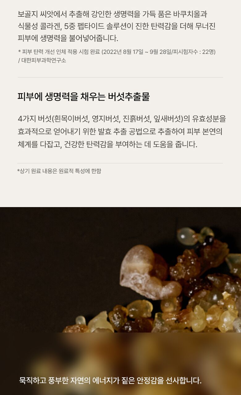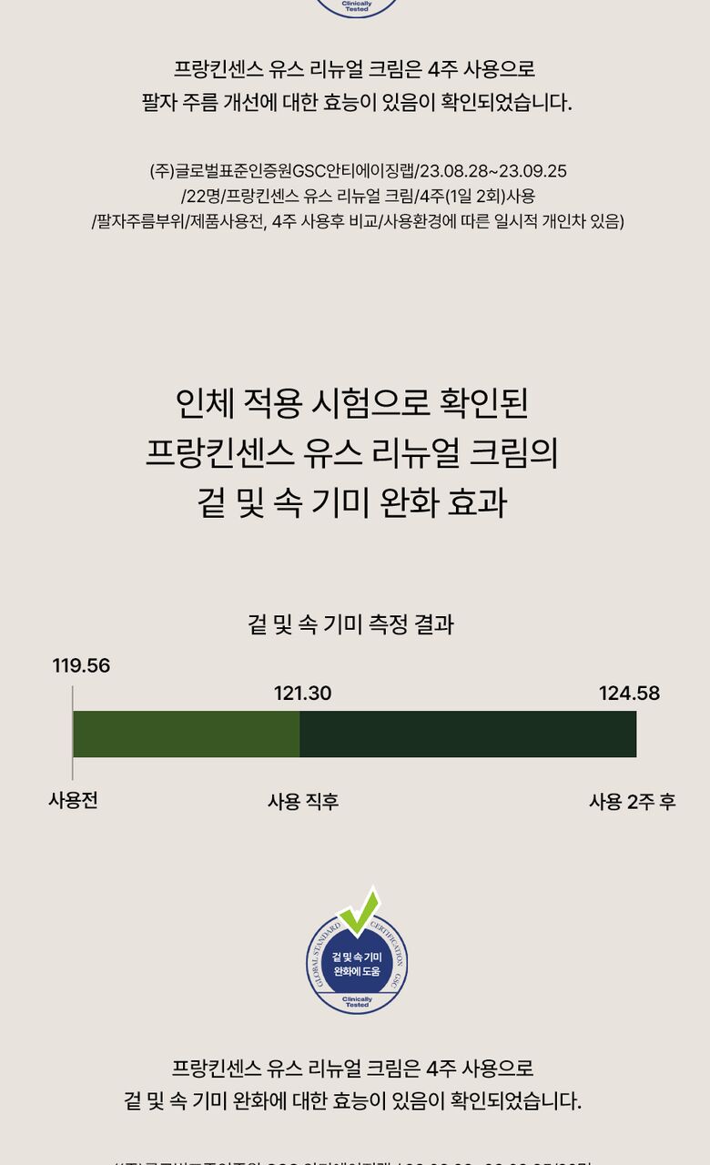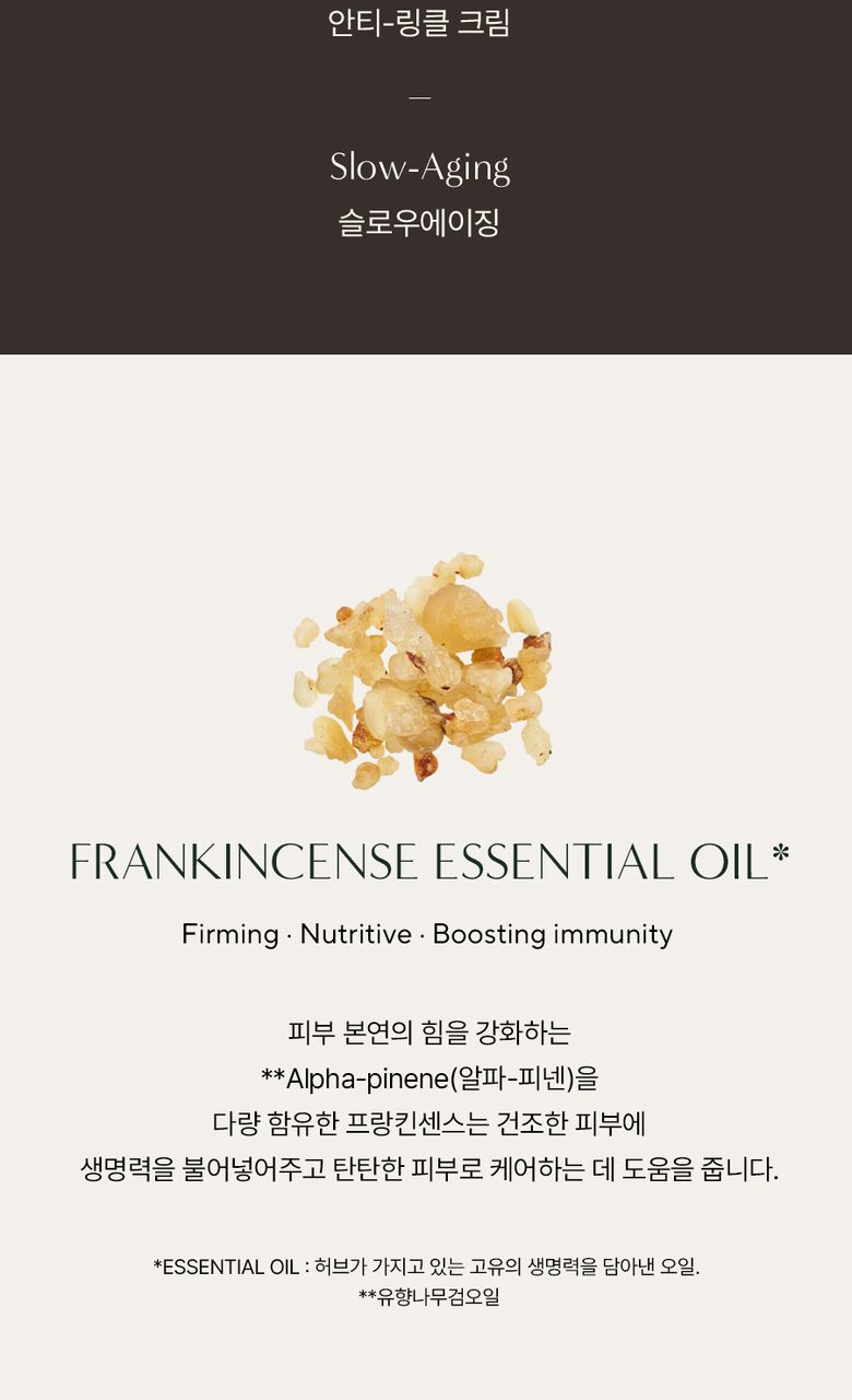 | 원료/성분 | 프랑킨센스 세럼: 흰목이버섯추출물, 영지버섯추출물, 잎새버섯추출물, 진흙버섯추출물, 정제수, 부틸렌글라이콜, 글리세린, 판테놀, 카프릴릭/카프릭트라이글리세라이드, 에틸헥실팔미테이트, 나이아신아마이드, 호호바씨오일, 트라이에틸시트레이트, C14-22 알코올, 에리스리톨, 바쿠치올, 베타-글루칸, 호호바에스터, 글리세릴글루코사이드, C12-20 알킬글루코사이드, 1,2-헥산다이올, 세테아릴알코올, 하이드로제네이티드레시틴, 카프릴릴글라이콜, 스타아니스추출물, 잔탄검, 아데노신, 유향나무검오일(400ppm), 라다넘수지, 웨스트오스트레일리아산달우드목부오일, 라반딘오일, 알지닌, 카보머, 타마린드씨폴리사카라이드, 피마자씨오일, 분비나무오일, 다이소듐이디티에이, 로즈마리잎오일, 한련초추출물, 인도멀구슬나무꽃추출물, *리날룰, 홀리바질잎추출물, 인도멀구슬나무잎추출물, *리모넨, 소듐하이알루로네이트, 비피다발효용해물, 락토바실러스발효용해물, 울금뿌리추출물, 참산호말추출물, *파네솔, 글루코오스, 드럼스틱씨오일, 콜라겐, 토코페롤, 류코노스톡/무발효여과물 *에센셜오일에서 자연적으로 발견되는 성분프랑킨센스 크림: 글리세린, 흰목이버섯추출물, 정제수, 시어버터, 카프릴릭/카프릭트라이글리세라이드, 영지버섯추출물, 잎새버섯추출물, 진흙버섯추출물, 부틸렌글라이콜, 바바수씨오일, 스위트아몬드오일, C13-15알케인, 나이아신아마이드, 1,2-헥산다이올, 세테아릴글루코사이드, 솔비탄스테아레이트, 세테아릴알코올, 솔비탄올리베이트, 폴리글리세릴-6올리에이트, 바쿠치올, 베타-글루칸, 베타인, 호호바에스터, 판테놀, 세테아릴스테아레이트, 아크릴레이트/C10-30알킬아크릴레이트크로스폴리머, 알지닌, 카프릴릴글라이콜, 잔탄검, 스타아니스추출물, 아데노신, 인도멀구슬나무꽃추출물, 유향나무검오일(400ppm), 라다넘수지, 웨스트오스트레일리아산달우드목부오일, 라반딘오일, 홀리바질잎추출물, 인도멀구슬나무잎추출물, 한련초추출물, 피마자씨오일, 분비나무오일, 로즈마리잎오일, 비피다발효용해물, 락토바실러스발효용해물, *리날룰, 울금뿌리추출물, *리모넨, 참산호말추출물, *파네솔, 드럼스틱씨오일, 카퍼트라이펩타이드-1, 콜라겐, 아세틸헥사펩타이드-8, 팔미토일펜타펩타이드-4, 토코페롤, 류코노스톡/무발효여과물, 팔미토일테트라펩타이드-7, 팔미토일트라이펩타이드-1 |