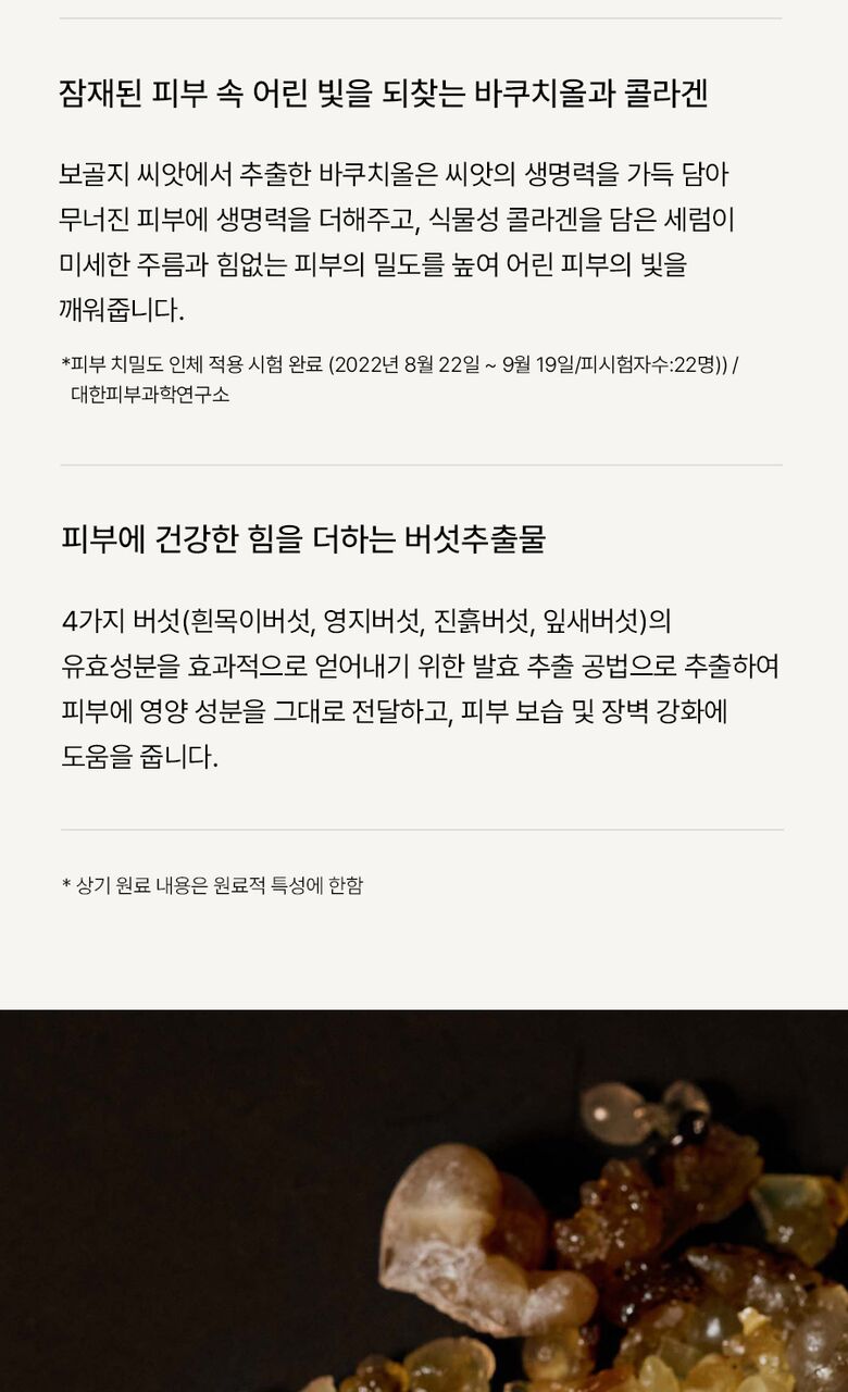 | 원료/성분 | 흰목이버섯추출물, 영지버섯추출물, 잎새버섯추출물, 진흙버섯추출물, 정제수, 부틸렌글라이콜, 글리세린, 판테놀, 카프릴릭/카프릭트라이글리세라이드, 에틸헥실팔미테이트, 나이아신아마이드, 호호바씨오일, 트라이에틸시트레이트, C14-22 알코올, 에리스리톨, 바쿠치올, 베타-글루칸, 호호바에스터, 글리세릴글루코사이드, C12-20 알킬글루코사이드, 1,2-헥산다이올, 세테아릴알코올, 하이드로제네이티드레시틴, 카프릴릴글라이콜, 스타아니스추출물, 잔탄검, 아데노신, 유향나무검오일(400ppm), 라다넘수지, 웨스트오스트레일리아산달우드목부오일, 라반딘오일, 알지닌, 카보머, 타마린드씨폴리사카라이드, 피마자씨오일, 분비나무오일, 다이소듐이디티에이, 로즈마리잎오일, 한련초추출물, 인도멀구슬나무꽃추출물, *리날룰, 홀리바질잎추출물, 인도멀구슬나무잎추출물, *리모넨, 소듐하이알루로네이트, 비피다발효용해물, 락토바실러스발효용해물, 울금뿌리추출물, 참산호말추출물, *파네솔, 글루코오스, 드럼스틱씨오일, 콜라겐, 토코페롤, 류코노스톡/무발효여과물 *에센셜오일에서 자연적으로 발견되는 성분 |