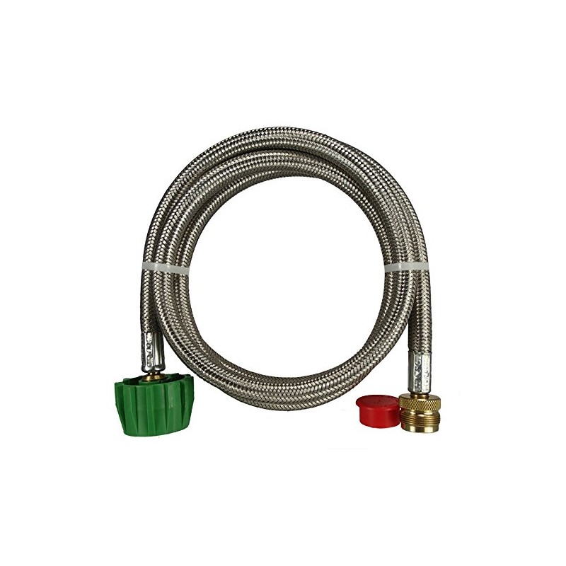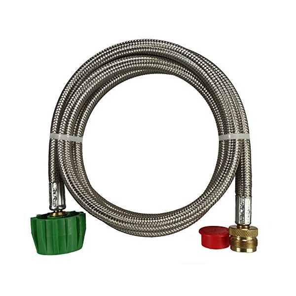 Type 1 tank Weber Q Propane hose assembly used to connect a small portable camping appliance such as a grill, heater, or lantern to a refillable 20# or 30# propane cylinder. Replaces a disposable 1# Bottle for longer periods of appliance usage. Stainless Steel Overbraid provides protection from small animals and rodents chewing through the hose.