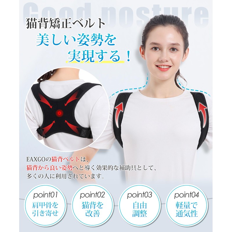- 【理学療法士共同監修・猫背解消】猫背は、見た目だけでなく、健康にも悪影響を及ぼす可能性がある一般的な姿勢の問題です。この問題を解決するために、理学療法士は長年の研究と実践を経て、「猫背矯正ベルト」を開発しました。この製品は特別に猫背を矯正するための補助具として設計されています。✅EAXGOの猫背矯正ベルトを使用することで、人々は猫背を解消し、健康的で背筋の伸びた姿勢を形成できます。さらに、筋肉の緊張と疲労を改善し、血液循環を促進し、痛みと不快感を和らげる効果も期待できます。EAXGOが特別にデザインした猫背矯正ベルトを着用することで、簡単に猫背の悪い姿勢を解消し、シェイプアップ効果を楽しみながら健康的な体型を手に入れることができます。
