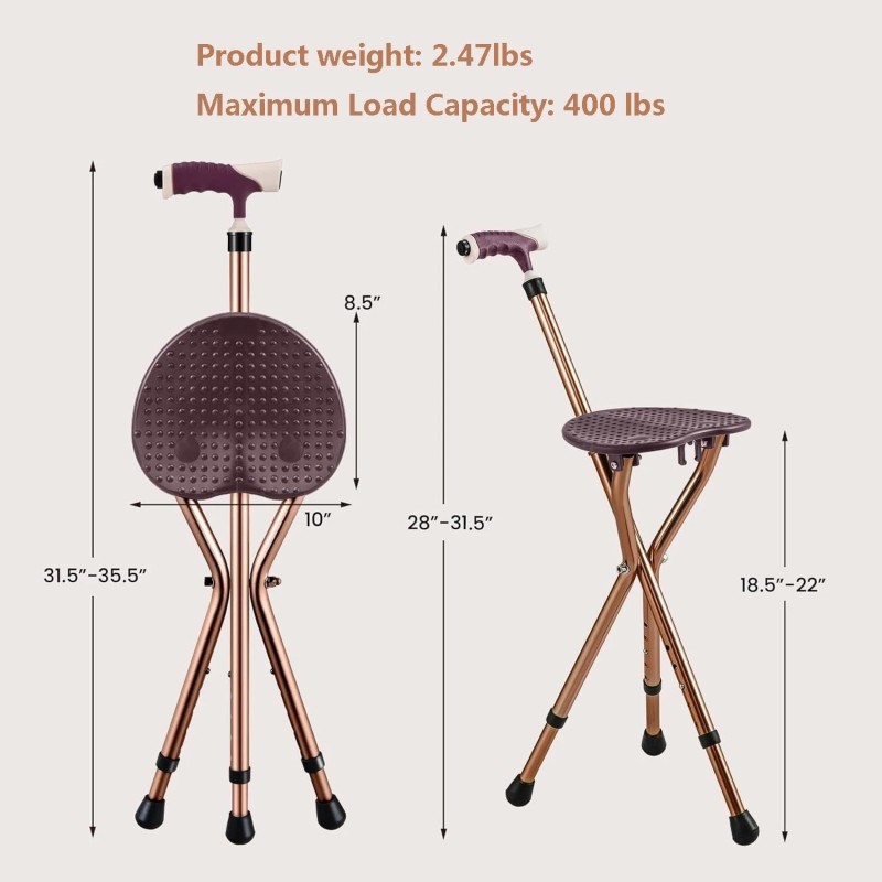 Safe and Comfort - tripod design for increased stability to provide a comfortable seat to rest on when open, and a sturdy support cane when closed; Vinyl tipped, contoured legs are strong and stable