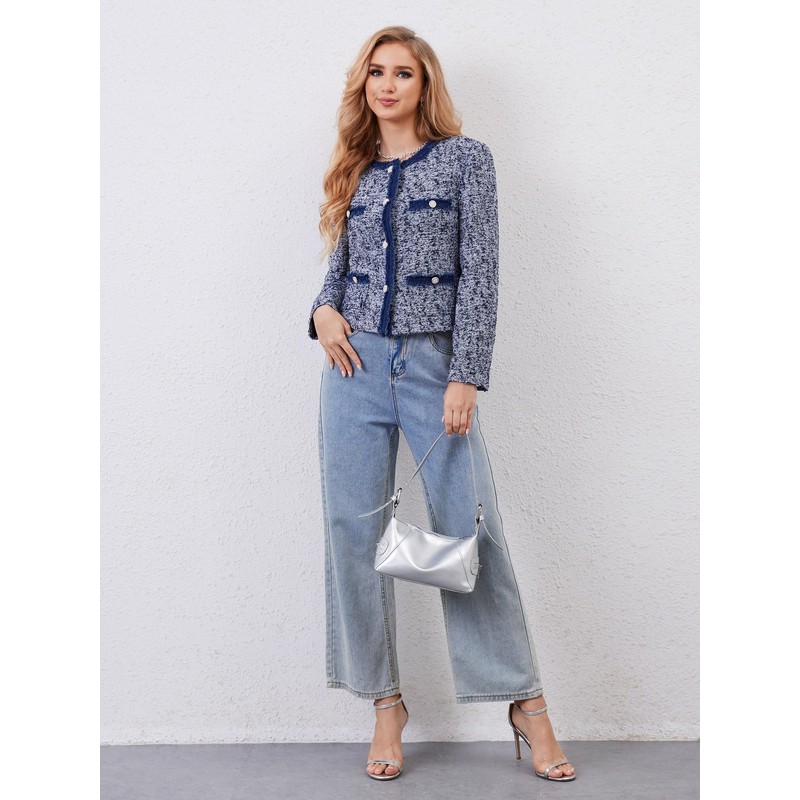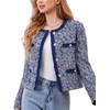- Women’s tweed blazers jacket features with crop cardigan, long sleeve, metal button closure, with 2 pockets, luxurious braid decor, collarless, crewneck. Presenting an elegant warm fall winter.